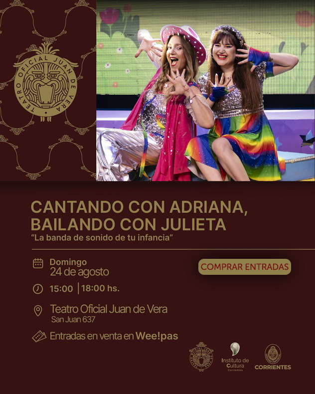 Y el domingo 24 de agosto, en dos funciones, a las 15 y a las 18 hs. llega la obra de teatro infantil “Cantando con Adriana y bailando con Julieta”, con entradas a la venta en https://tinyurl.com/mrks7k8a