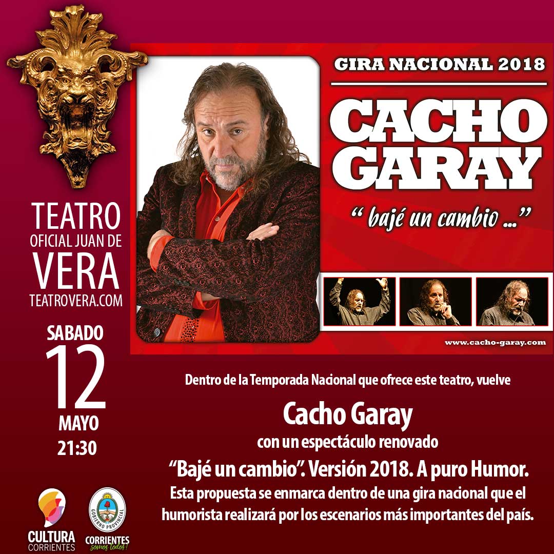 Dentro de la Temporada Nacional que ofrece este teatro, se presentará el sábado 12 de mayo a las 21:30, Cacho Garay con un espectáculo renovado, “Bajé un cambio”. Versión 2018. A puro Humor. Esta propuesta se enmarca dentro de una gira nacional que el humorista realizará por los escenarios más importantes del país.