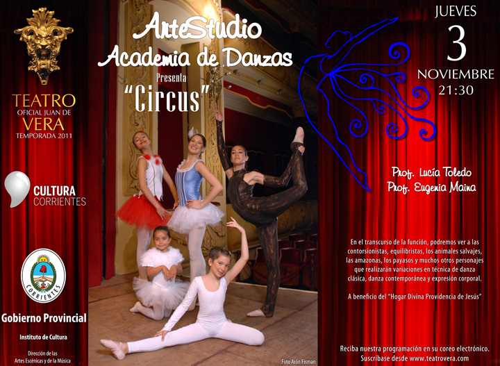 Realizado por los alumnos de la academia de danza ArteStudio, a cargo de las profesoras Lucia de los A. Toledo y Eugenia Maina, se realizará el jueves 3 de noviembre la presentación del espectáculo “Circus”, dentro del Ciclo de Danza Regional que el Vera diseñó para esta Temporada 2011.