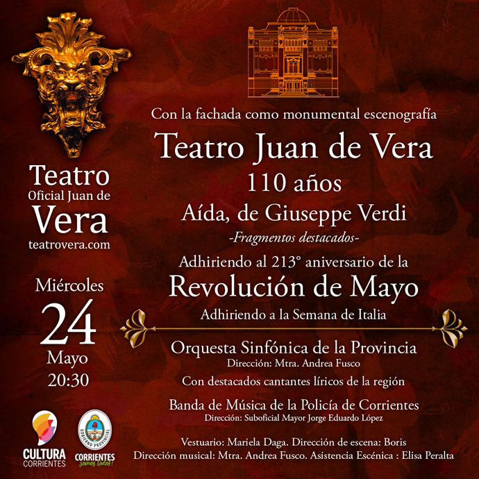 La celebración tendrá como artística excepcional la reposición de fragmentos de la Ópera AIDA del gran compositor italiano Giuseppe Verdi, rescatando sus arias más notables y teniendo la fachada del teatro como monumental escenografía.