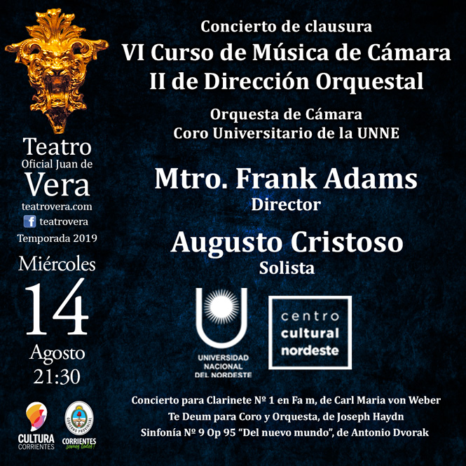 En el teatro Vera, será el concierto de cierre que se brindará, bajo la dirección del Mtro. holandés Frank Adams, el miércoles 14 de agosto a las 21:30 y con entrada gratuita. Participarán del mismo: La Orquesta de Cámara, El coro Universitario de la UNNE y el Curso de Dirección Orquestal.