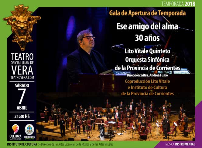 El sábado 7 de abril a las 21:30 será el concierto que brindará Lito Vitale Quinteto, junto al organismo provincial dirigido por la Mtra. Andrea Fusco, para celebrar estos 30 años del material discográfico del músico. Emblemático nombre del disco más reconocido del músico, que también tuviera un programa televisivo homónimo.