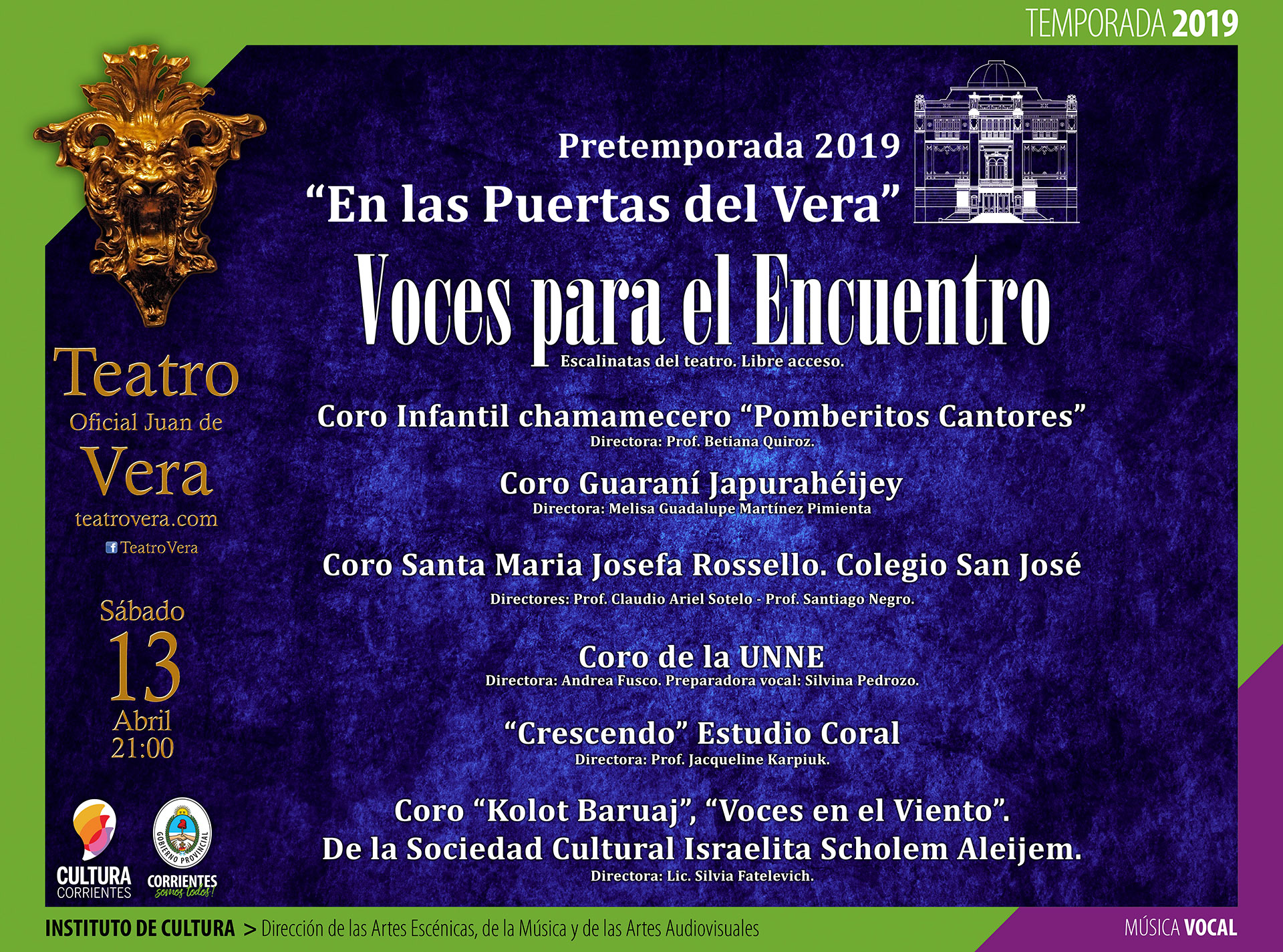 Son seis coros los que participarán de la clausura de la Pre- Temporada 2019 del Teatro Vera, este sábado 13 de abril a las 21 hs, con acceso libre y gratuito. Para la propuesta “Voces para el Encuentro” del Ciclo "En las puertas del Vera", participarán: el Coro del Colegio San José bajo la dirección del Prof. Santiago Negro y Ariel Sotelo; el Coro Kolot Barúaj, Voces en el viento, con la dirección de la Licenciada Silvia Fatelevich; El Coro de la UNNE, bajo la batuta de la Maestra Andrea Fusco; "Crescendo Estudio Coral”, dirigido por la Prof. Jacqueline Karpiuk. Otro de los Coros invitados es el Japurahéijey, que significa Cantemos nuevamente, dirigido por Melisa Guadalupe Martínez Pimienta y tiene la característica de que sus interpretaciones son totalmente en guaraní. Y finalmente, el Coro infantil chamamecero “Pomberitos Cantores” dirigidos por la Prof. Betiana Belén Quiroz, conformado por niños .