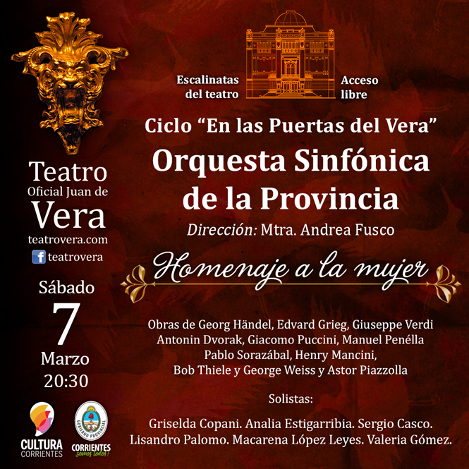El Instituto de Cultura de Corrientes invita a la comunidad a asistir al primer concierto del año de la Orquesta Sinfónica de la Provincia, a realizarse el sábado 7 de marzo, a las 20,30, en las escalinatas del Teatro Vera. En esta oportunidad, la presentación será con cantantes invitados y un repertorio especialmente preparado para homenajear a la Mujer, en vísperas de su día.