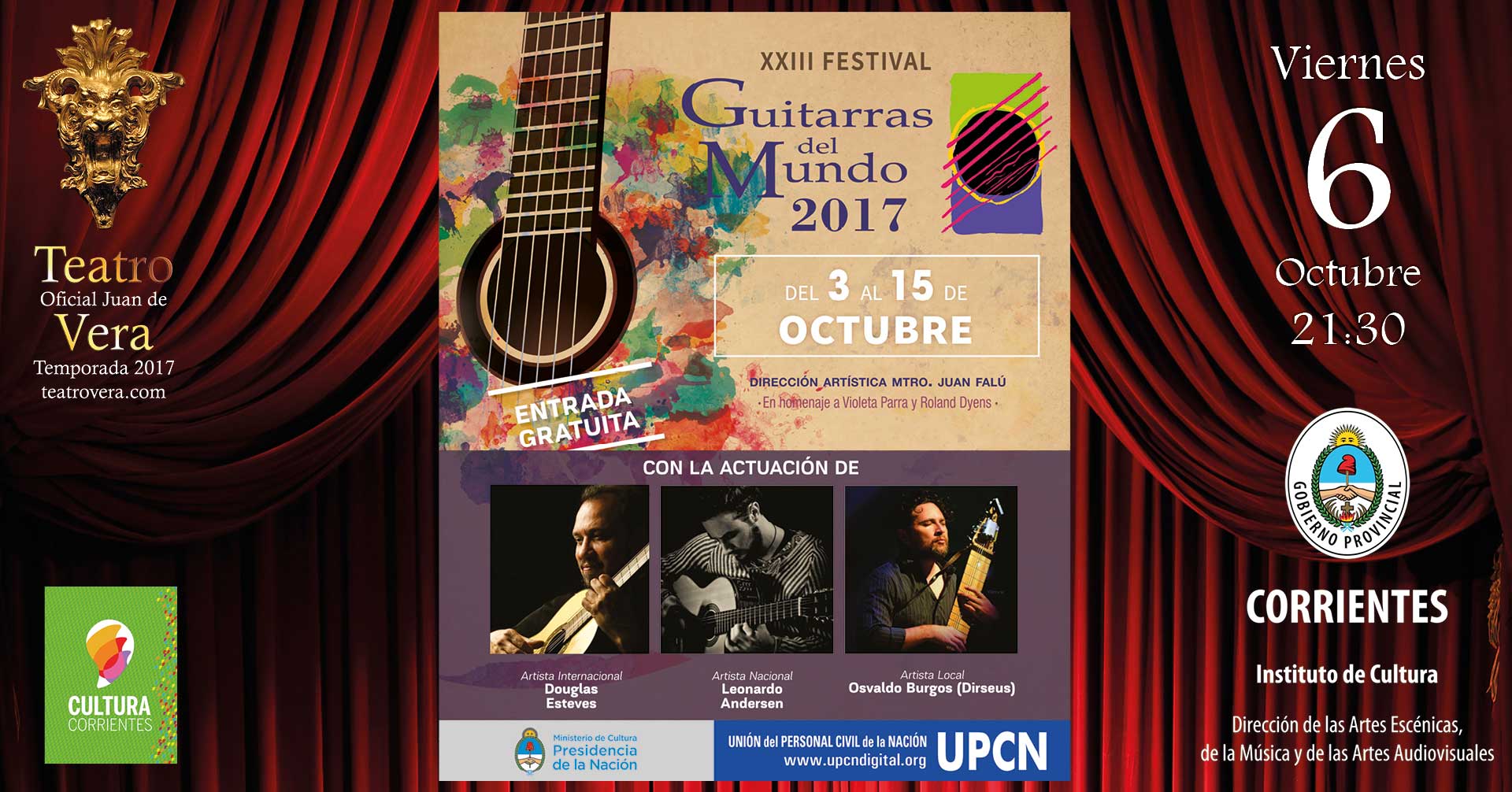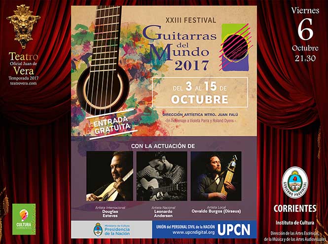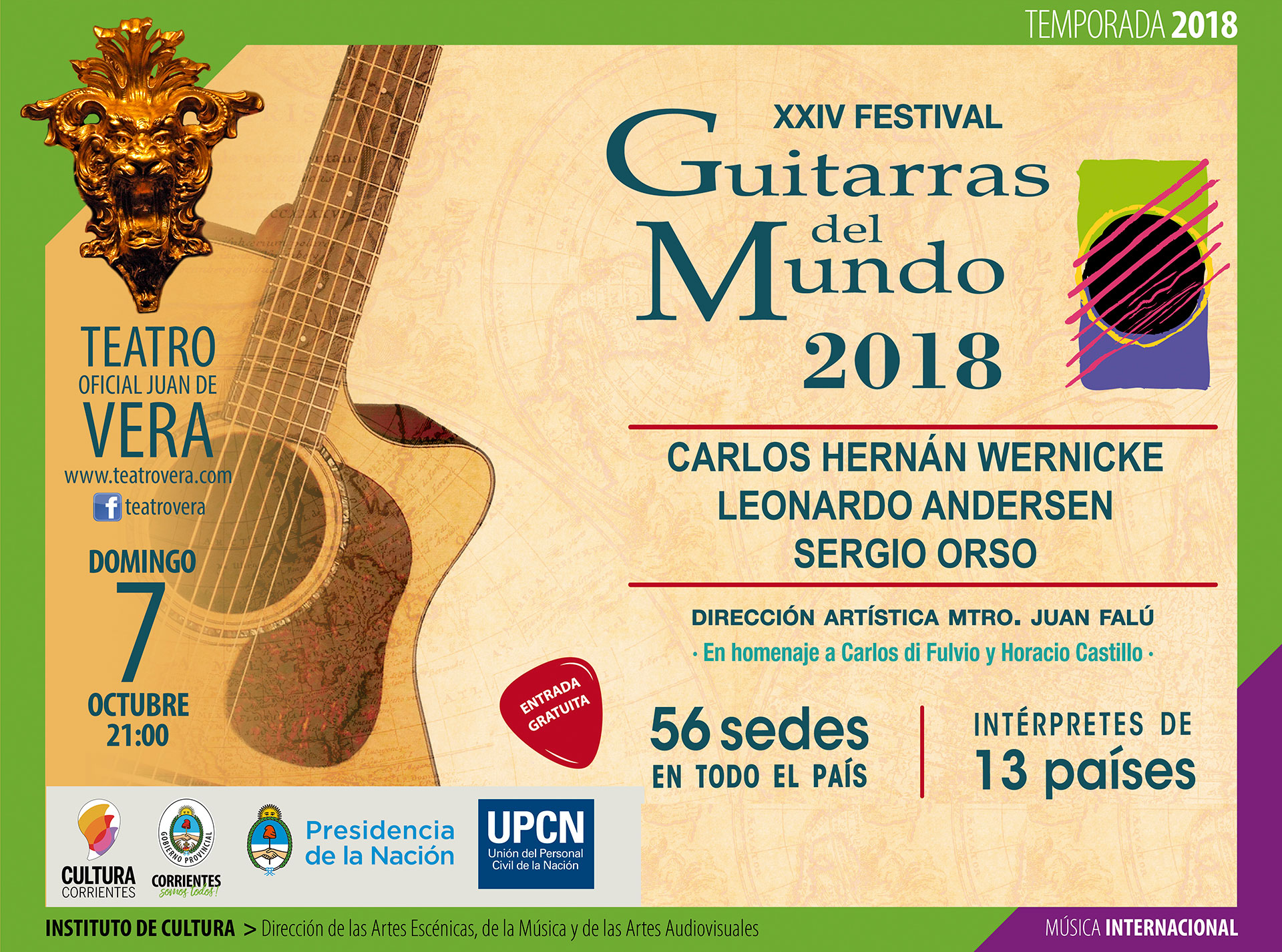 El domingo 7 de octubre desde las 21:00, será la tradicional velada del Festival Internacional de Guitarras del Mundo, que lleva 24 ediciones realizadas, conociéndose ya, quienes son los tres guitarristas que se presentarán a la comunidad correntina en el Teatro Vera con entrada Gratuita. A nivel internacional participará Carlos Hernán Wernicke, un argentino que reside en España. A nivel nacional se presenta Leonardo Andersen y como representante local, resultó elegido por el jurado, Sergio Orso de Goya.