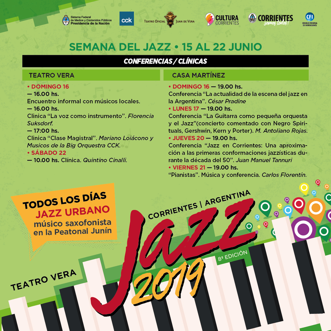 El Teatro Vera, la ex Casa Martínez, el bar El Mariscal y la peatonal Junín serán sede durante ocho días de atractivas propuestas artísticas, clases magistrales y las Jams Sessions. En esta oportunidad, habrá además aporte del CCK como “Espacio asociado”. todo con el apoyo del Consejo Federal de Inversiones (CFI)
