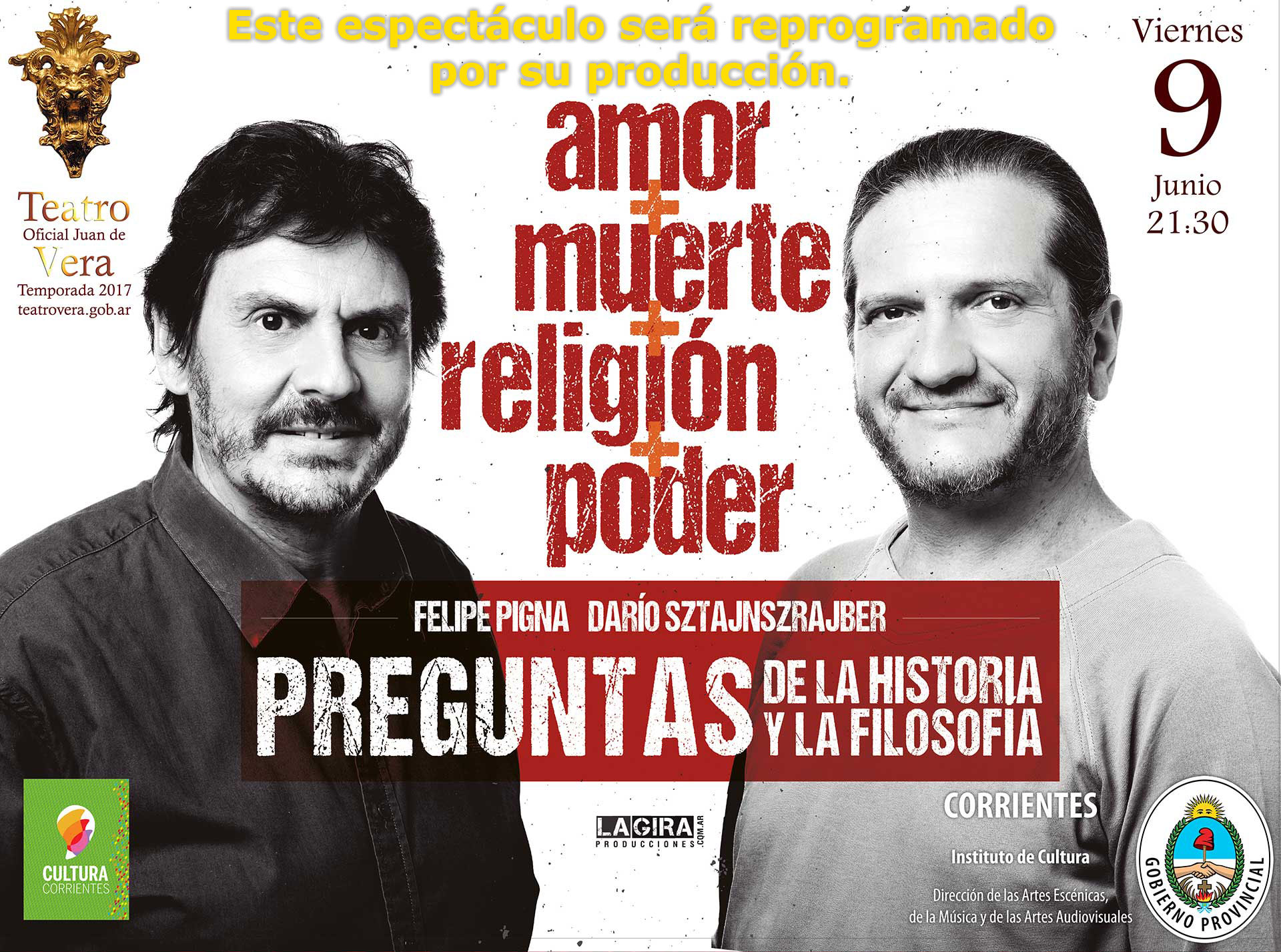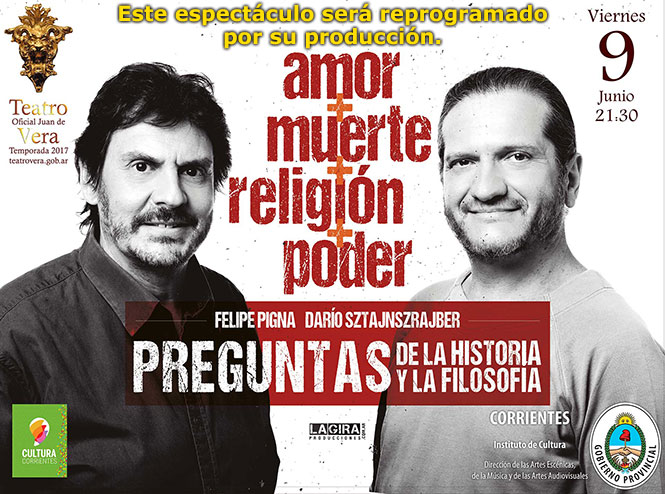 Por medio de la presente, La Gira Producciones S.R.L. en nombre del espectáculo “Preguntas de la Historia y la Filosofía”, se disculpa con el público ya que por razones de fuerza mayor se tendrá que reprogramar la función planteada para el viernes 9 de Junio.